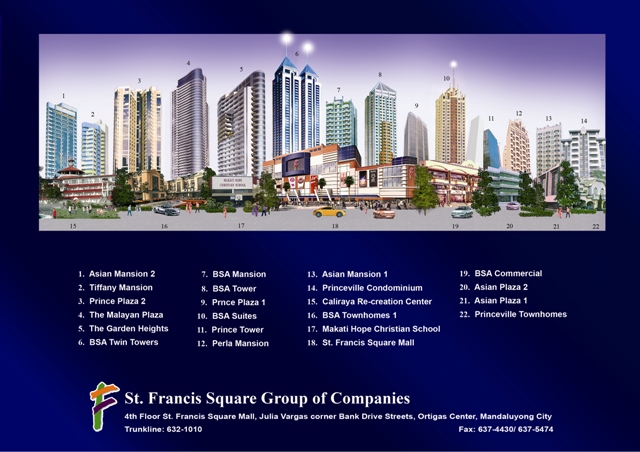 St. Francis Square Group of companies started with the development of middle income real estate projects in 1980. Since then, SFS Froup of Companies started investing in prime Makati properties in Dasmarinas, Bel-Air, Magallanes and San Lorenzo Villages.